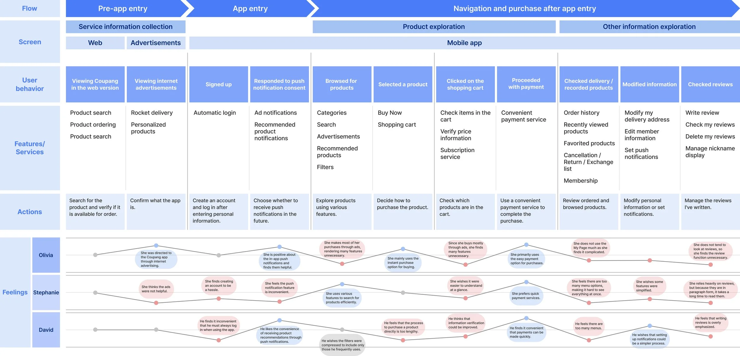 Based on the results of observing the behavior patterns of the user group interviewed and the process of using the app, we created three personas representing various user archetypes. These personas encompass diverse usage scenarios to cater to potential customers who may use Coupang.